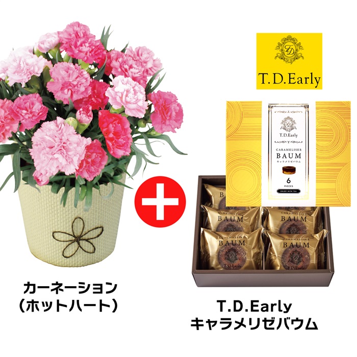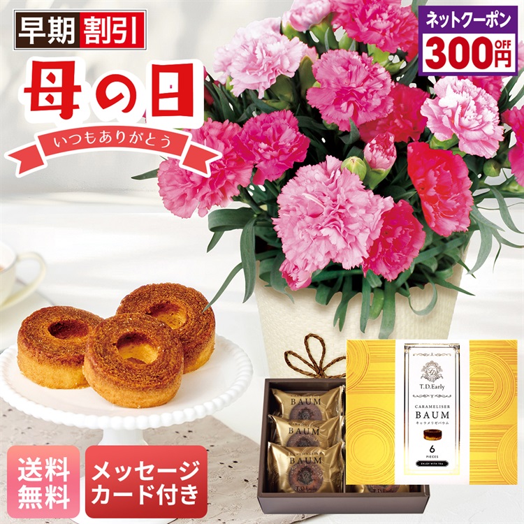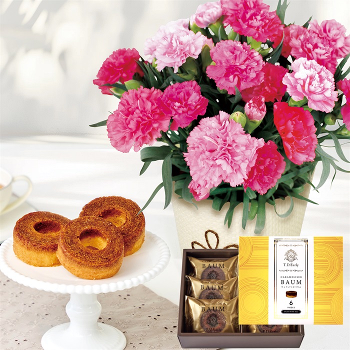 【商品内容】カーネーション4号鉢、バスケット、お手入れのしおり、キャラメリゼバウム×6 ”商品サイズ:幅約12cm×高さ約25cm”■賞味期限:製造後100日■包装形態:包装不可■熨斗:対象外■配達区分:常温■希望着日:不可■受付終了日:5/1 9:59まで■お届期間:5/6-5/10■外装サイズ:縦30cm×横30cm×高さ55cm■型番:B40-1■全国配送:無し
